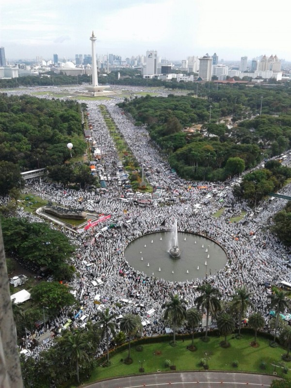 Melihat foto-foto drone di kawasan Monas, suasana para peserta aksi yang duduk bersila di atas sejadah membuat formasi yang menakjubkan. Dari atas, sekilas kawasan Monas tampak seperti Ka’bah yang dikelilingi Jemaah haji. Foto-foto ini pun sangat viral dan banyak diunggah netizen di media sosial.