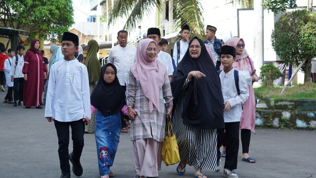 Calon santri dan walinya berjalan menuju ruangan tes penerimaan santri baru (dok.Condong Media)