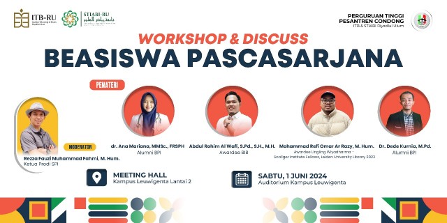 Pada (01/06) Kampus Perguruan Tinggi Pesantren Condong yaitu ITB-RU dan STIABI-RU melalui prodi Sejarah Peradaban Islam dan HIMASPI mengadakan Workshop & Discuss Beasiswa Pascasarjana. Kegiatan ini diinisiasi sebagai salah satu bentuk perhatian kampus pada mahasiswanya untuk terus melanjutkan studi ke jenjang yang lebih tinggi.