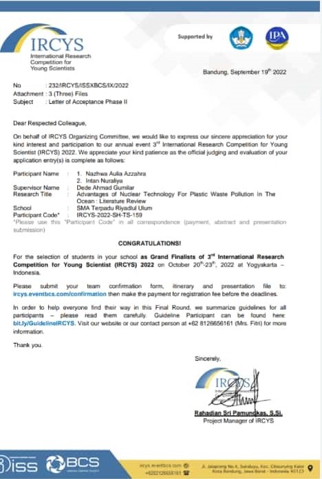 Dibawah bimbingan Bapak Dede Ahmad Gumilar yang merupakan guru mata pelajaran Metodologi Penelitian, Nazhwa dan Intan mengangkat topik tentang pemanfaatan teknologi nuklir dalam mengatasi dan mengendalikan sampah plastik dengan judul “Advantages of Nuclear Technology for Plastic Waste Pollution in The Ocean-Literature Review”. Sesuai dengan judulnya yang menggunakan bahasa Inggris, tulisan yang disusun oleh keduanya pun menggunakan bahasa Inggris.