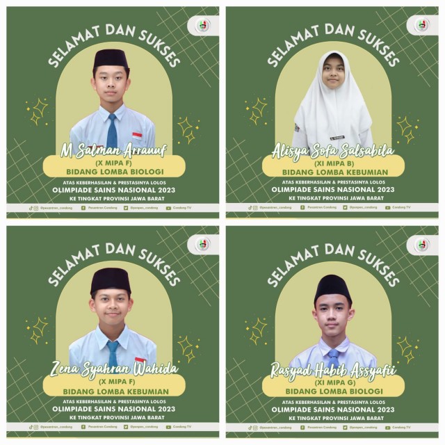 Mereka yang berhasil lolos adalah Rasyad Habieb Asyafi’i ( Peringkat 1 Bidang Biologi), M. Salman Arra'uuf ( Peringkat 3 Bidang Biologi ), Zena Syahran Wahida ( Peringkat 1 Kebumian ) dan Alisya Sofa Salsabila ( Peringkat 1 Bidang Kebumian ). Semoga mereka bisa berusaha sebaik mungkin untuk membawa nama Pesantren Condong dikancah Nasional maupun Internasional. Aamiin.