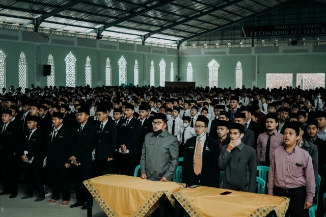 Jajaran guru dan santri berdiri menyanyikan lagu wajib Indonesia Raya dn Hymne Oh Pondokku (Dok. Condong Media)