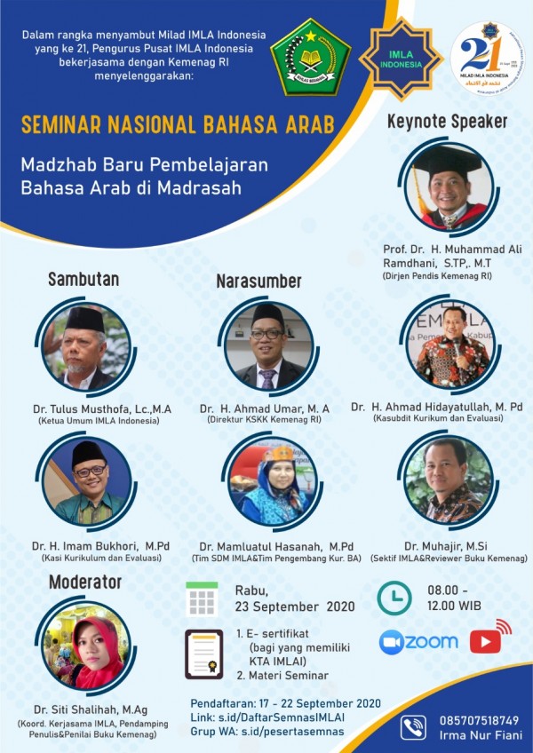 Seminar ini dilaksanakan selama tiga hari, yaitu rabu sampai jumat, 23-25 September 2020. Hari rabu diawali dengan seminar kurikulum bahasa arab yang dihadiri oleh Bapak Dirjen Pendis Kemenag RI, Bapak Kasubdit dan Evaluasi Kemenag RI, Bapak Ketua Umum IMLA Indonesia dan Guru-guru serta Dosen undangan. Sedangkan hari kamis yaitu seminar bahasa arab tentang pengembangan pengajaran keterampilan berbahasa arab yang diikuti oleh Dosen dosen bahasa arab dari berbagai perguruan tinggi.