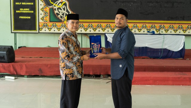 Ustaz Asep Saepul Alam, M.Pd., menerima cenderamata dari Pesantren Uswatun Hasanah (sok.condong media)