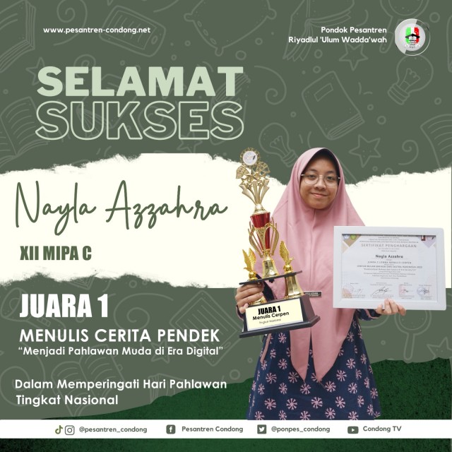 Setelah berhasil menjuarai lomba menulis cerpen tingkat Nasional di Universitas Siliwangi, tak lantas membuat Nayla Azzahra merapa puas, ia terus mencoba untuk mengembangkan potensinya. Nayla pun mengikuti kembali lomba menulis cerpen tingkat Nasional yang digelar oleh Andalasia Publisher dalam rangka memperingati hari pahlawan yang jatuh pada tanggal 10 November 2023 dengan tema “Menjadi Pahlawan Muda di Era Digital”.