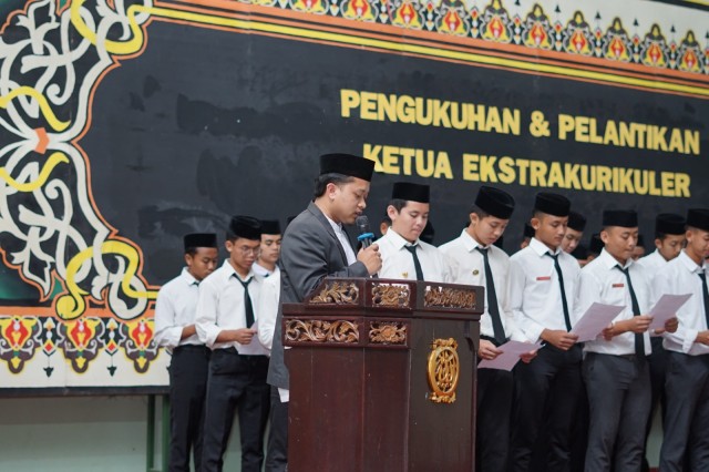 Staf pengasuhan bagian ekstrakurikuler, Ustaz Syahrul Nur Alim memimpin prosesi pelantikan (dok.condong media)