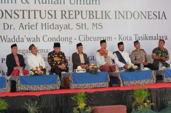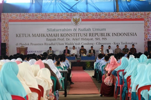 Condong-online.com-Tasikmalaya, Kunjungan Ketua Mahkamah Konstitusi Republik Indonesia yaitu Prof. Dr. Arief Hidayat, SH, MH. disambut meriah oleh ribuan santri serta seluruh civitas akademika di Pesantren Riyadlul `Ulum Wadda`wah. Parade Marching Band santirwati menghangatkan suasana kedatangan Bapak RI 9 ini. Pada hari sabtu, 3 Maret 2018 tepatnya pukul 18.00 sepanjang jalan menuju Auditorium Pesantren Condong terjajar barisan santri pembawa bendera merah putih. Hal ini diapresiasi penuh Bapak Ketua MK yang memberikan ciri santri dengan jiwa nasionalisme tinggi.